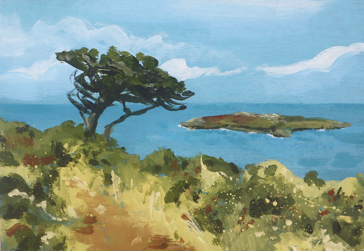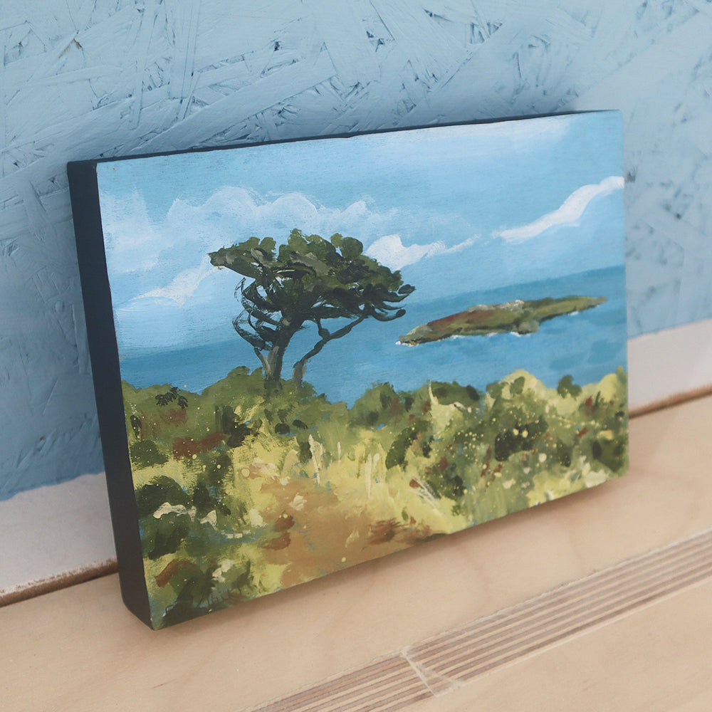 I have been giving painting a go for a change and have enjoyed getting to grips with acrylics. Here is a mini study I did of one of a tree at Pelistry, with Toll's Island behind.